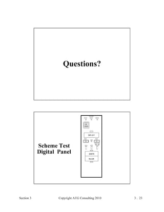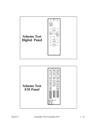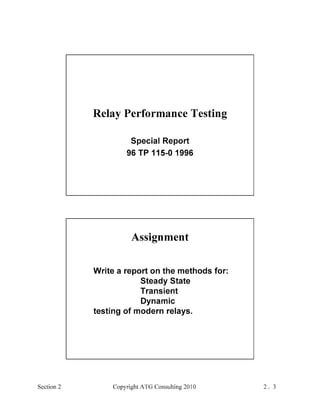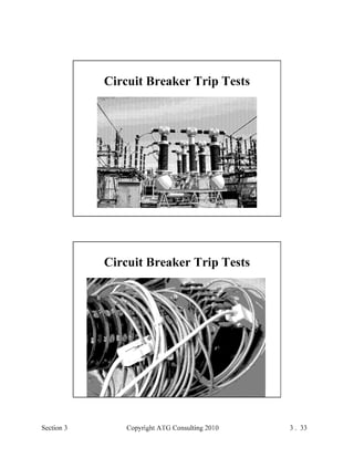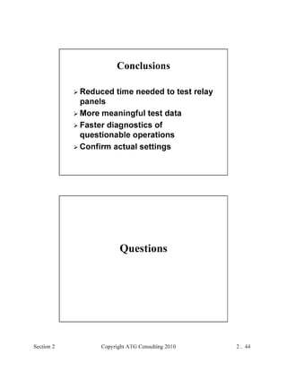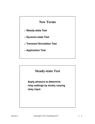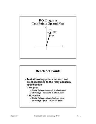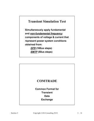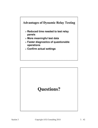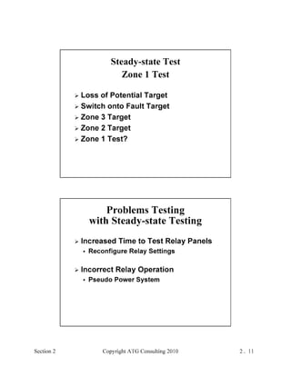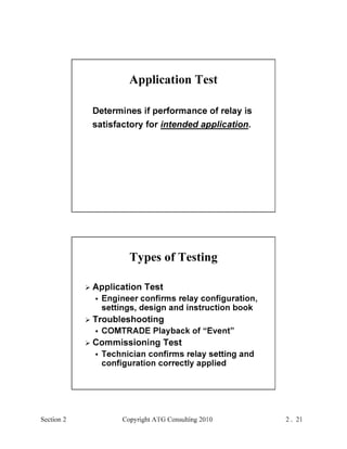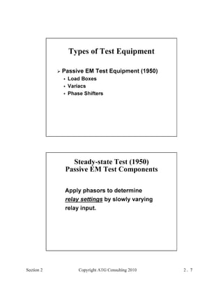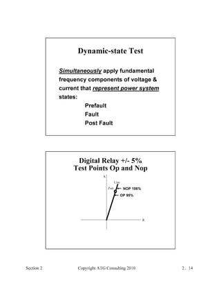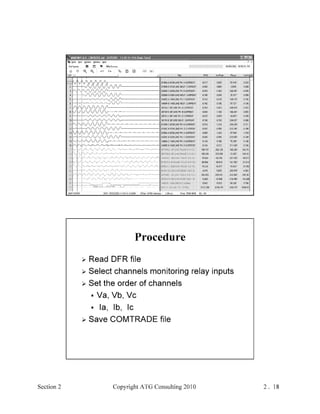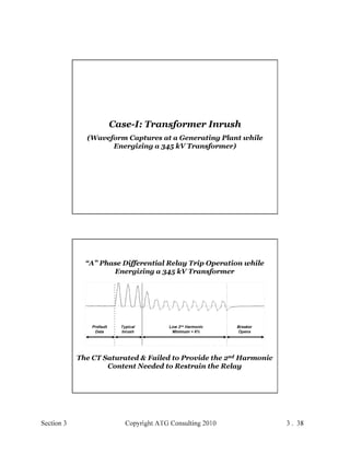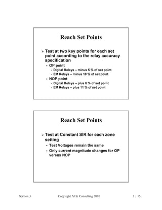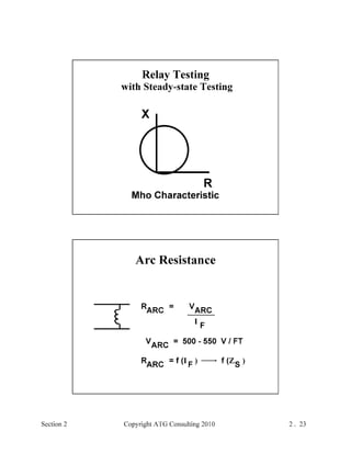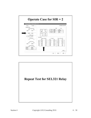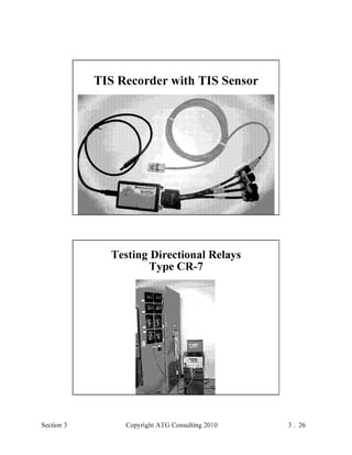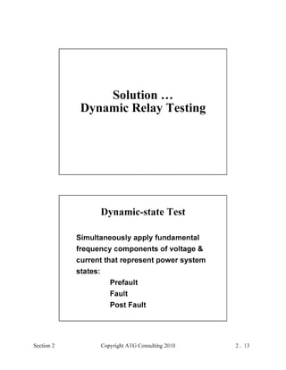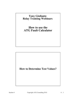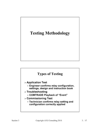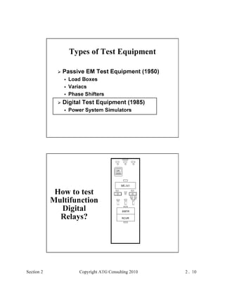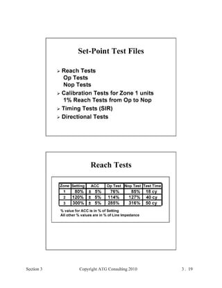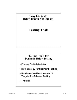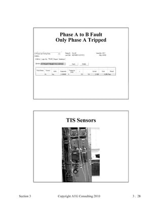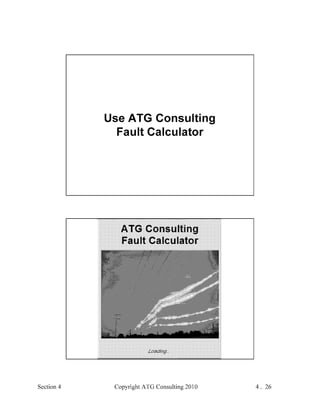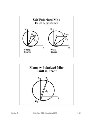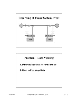 This document provides an outline and overview of a hands-on relay school covering transmission protection theory including symmetrical components and fault calculations. It discusses power system problems like faults and disturbances, different fault types, and introduces symmetrical components and how they are used to analyze balanced and unbalanced systems. It also covers per unit systems, calculating sequence networks for faults, and evaluating transmission line, generator, and transformer impedances.