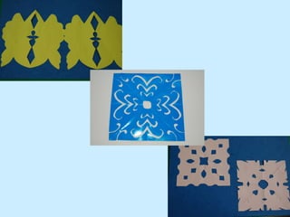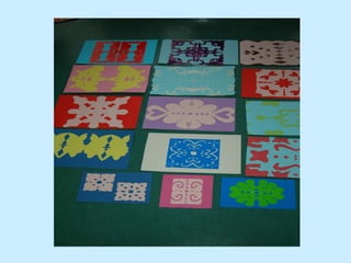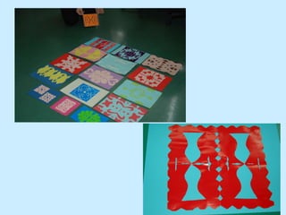 We cut a sheet of colorful paper into sections to make napkins, then glued the napkins onto another sheet of colorful paper to create a symmetrical art project using cutouts. The document provides instructions for a craft where children cut a paper into sections to make napkins, then glue the napkins onto a different paper to make a symmetrical picture using cutouts.