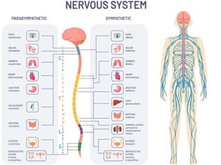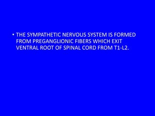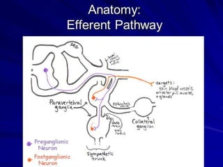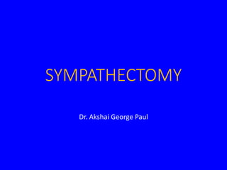 The sympathetic nervous system is formed from preganglionic fibers exiting the spinal cord from T1-L2 levels. These fibers synapse with postganglionic fibers in sympathetic ganglia near the spinal cord or travel to other ganglia nearer the organ. Sympathectomy increases blood flow by vasodilating arterioles, and is used to treat primary hyperhydrosis, Raynaud's syndrome, and other conditions. It can be performed chemically via percutaneous injection of alcohol/phenol or surgically via open, thoracoscopic, or laparoscopic approaches. Complications may include compensatory hyperhydrosis, gustatory sweating, or Horner's syndrome.