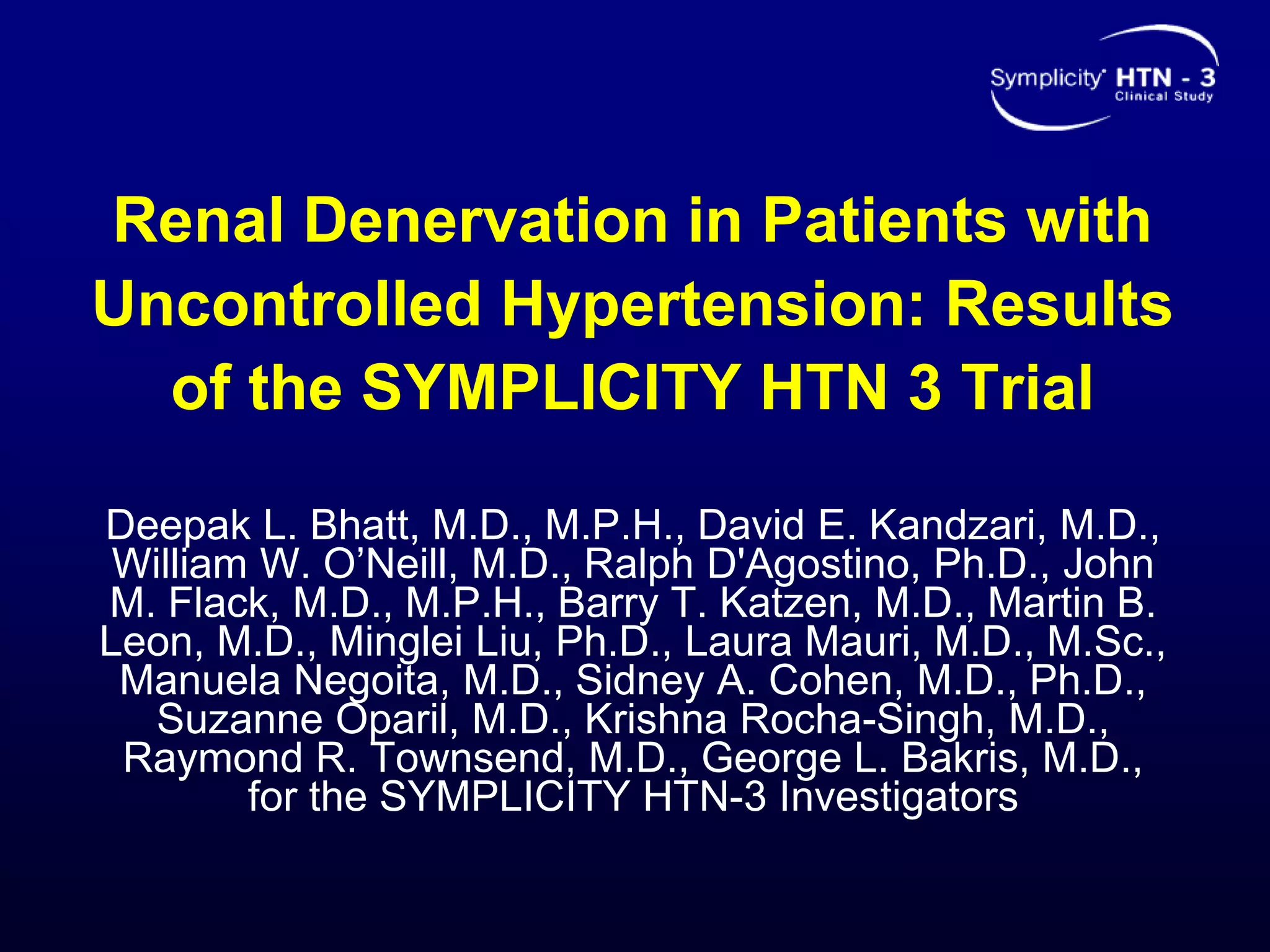 This randomized controlled trial evaluated the safety and efficacy of renal denervation for treatment-resistant hypertension. 535 patients with uncontrolled hypertension despite receiving 3 or more antihypertensive medications were randomized to renal denervation or a sham procedure. The primary outcome was the difference in office systolic blood pressure reduction between groups at 6 months, with a non-inferiority margin of 5 mmHg. Renal denervation did not meet the primary endpoint, with a between-group difference of -2.39 mmHg (p=0.26). It also did not meet the powered secondary endpoint of 24-hour ambulatory blood pressure change with a margin of 2 mmHg. Major adverse event rates were similar between groups