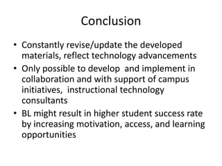 This document discusses redesigning a beginning German course through blended learning. It proposes reducing face-to-face class time from 4 to 3 hours per week and supplementing with online content. Benefits include increased scheduling flexibility, access to high-demand courses, and more opportunities for student-teacher and peer interaction. Content that can be effectively delivered online includes vocabulary introduction, reading comprehension, pronunciation practice, and writing exercises. The goals are to engage students through more interactive materials and use classroom time more effectively through preparation and review done online. Success will depend on continual revision and collaboration across the university.