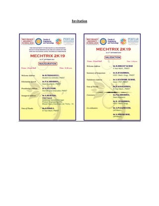 The document announces a National Level Technical Symposium organized by the Department of Mechanical Engineering at Periyar Maniammai Institute of Science & Technology on September 27, 2019. The day-long event included an inaugural ceremony with addresses by faculty and guest speakers, followed by technical presentations, competitions in CAD modeling, photography and other subjects. It concluded with a valedictory function where the winners received prizes. Over 250 students and 65 participants from other colleges benefited from the various events held at the symposium on industrial opportunities for mechanical engineering graduates.