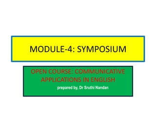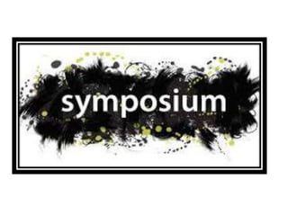 A symposium is a meeting organized so that experts in a given field can meet, present papers, and discuss issues and trends or make recommendations. The document outlines the typical format and organization of a symposium. It begins with a call for papers and selection of presenters. At the event, there is usually a welcome, keynote speaker, panel presentations, and question period. Outcomes may include publishing the papers and a review of discussions. Symposiums are smaller than conferences and focus on a particular issue, with the goal of gaining knowledge on a topic.