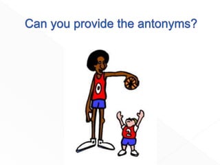 The document discusses synonyms and antonyms. Synonyms are words that have the same meaning, while antonyms are words that have opposite meanings. Examples of synonyms provided include big-large and happy-glad. Examples of antonyms include hot-cold and happy-sad. Students are instructed to write synonyms and antonyms on their mini whiteboards and hold them up to be checked.