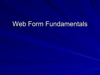 The document outlines the fundamentals of web forms, structured into three main sections: page directives, code declaration blocks, and code render blocks. It discusses the order of execution in event-driven .NET applications, including the use of event handlers and the concept of viewstate, which manages control data. Additionally, it emphasizes the flexibility of the .NET framework, comparing it to a vast collection of components that can be combined and extended.
