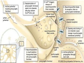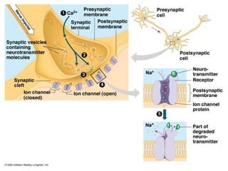 A synapse is a junction between two neurons that allows nerve impulses to be transmitted chemically or electrically. In a chemical synapse, an action potential causes calcium ions to enter the presynaptic neuron, triggering vesicles filled with neurotransmitters like acetylcholine to fuse with the presynaptic membrane and release their contents into the synaptic cleft. These neurotransmitters then bind to receptors on the postsynaptic neuron, causing ion channels to open and generating a postsynaptic potential that may be excitatory or inhibitory. Acetylcholine is removed from the synaptic cleft by diffusion and enzymatic breakdown to terminate its effect and allow subsequent impulses to be transmitted.