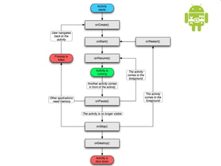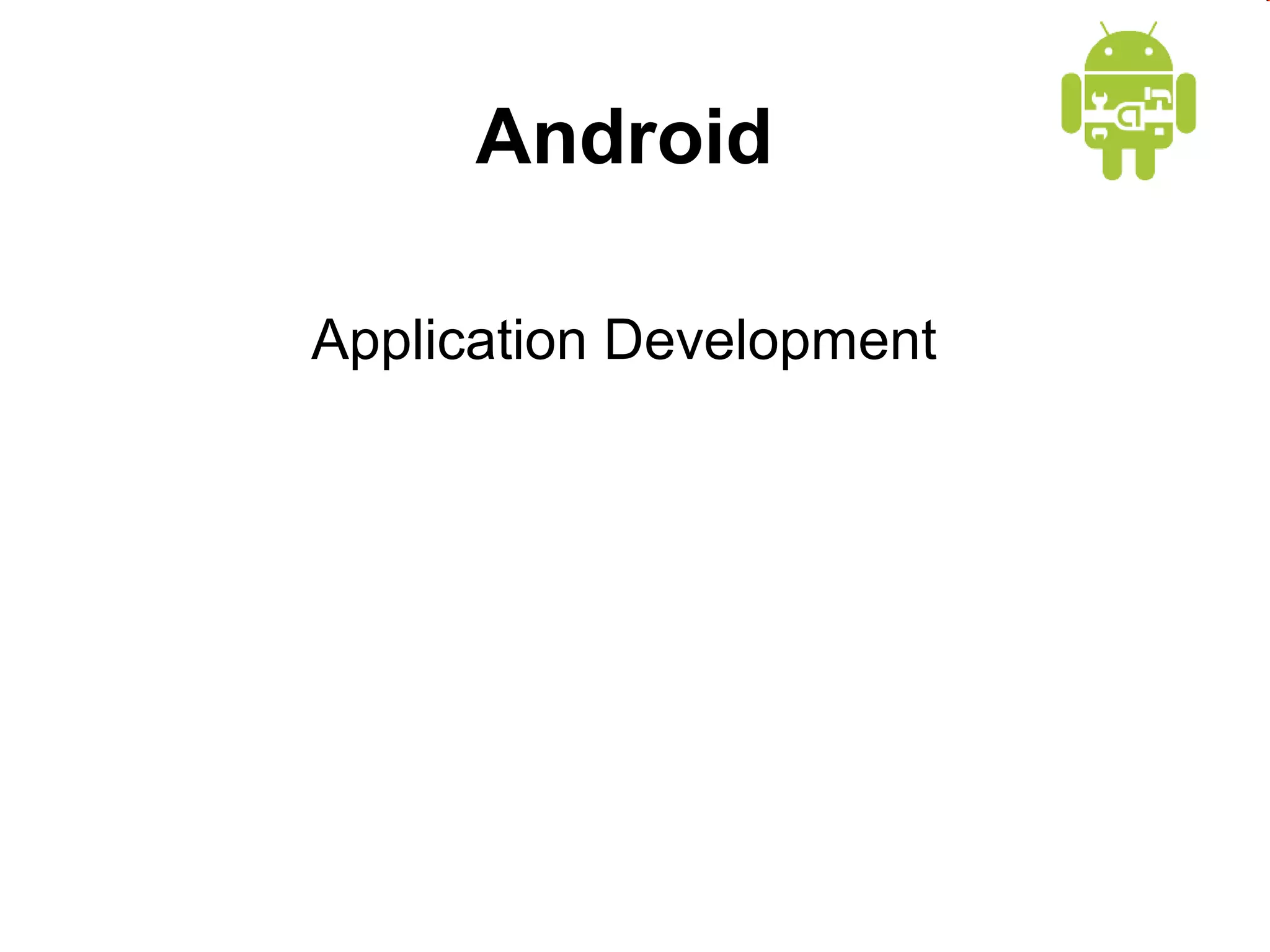 This document provides an overview of Android application development. It introduces the Android platform architecture which is based on the Linux kernel and includes libraries, a Java-compatible runtime, and an application framework. It describes the application building blocks of activities, intent receivers, services, and content providers. It also outlines the development tools used, including Eclipse and the emulator, and covers concepts like intents, notifications, and the application lifecycle. The objectives are to learn mobile application development on Android, understand the platform architecture and building blocks, and use the appropriate tools.