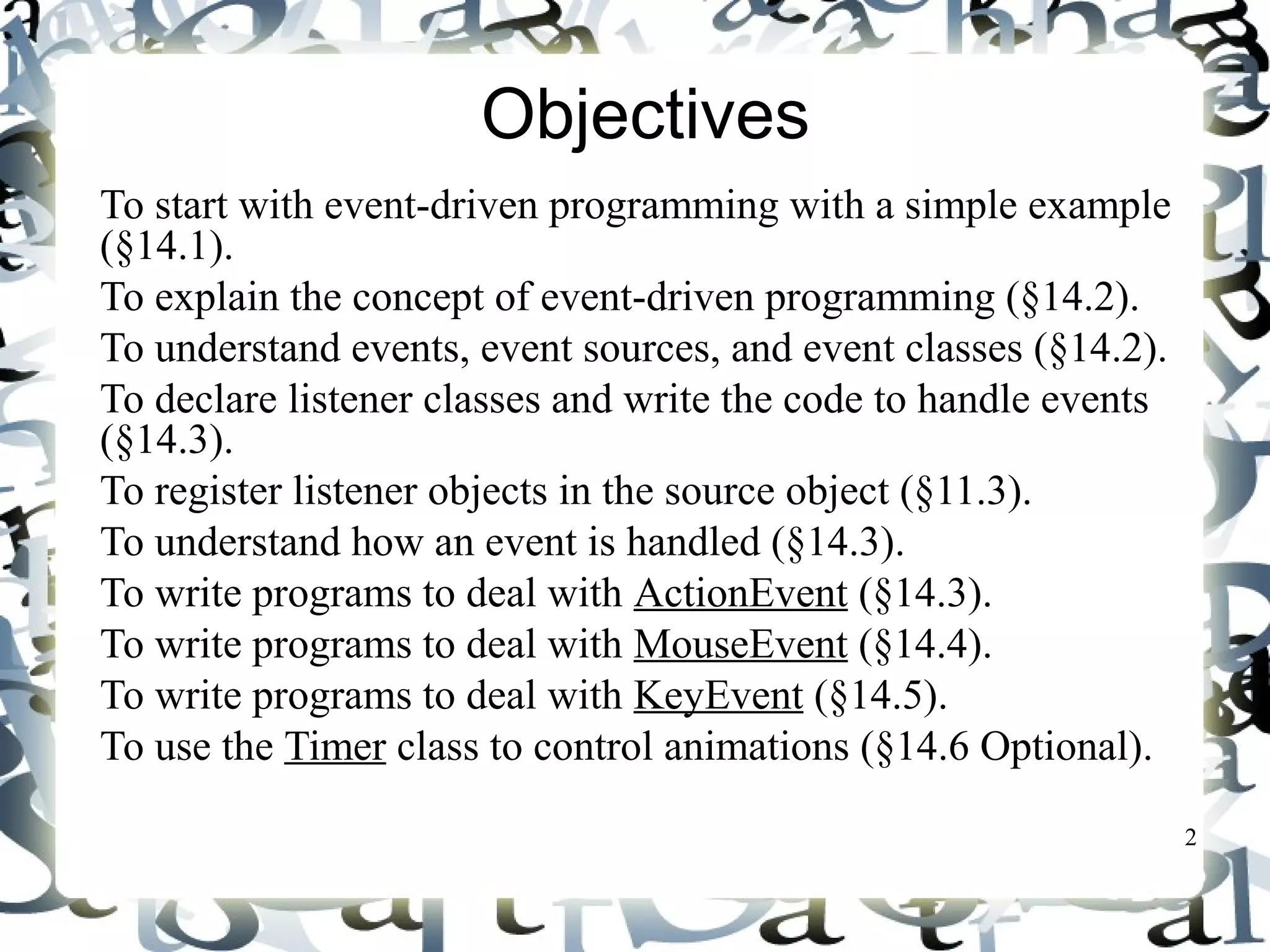 This document discusses event-driven programming in Java. It begins with an overview of procedural versus event-driven programming. Key topics covered include events, event classes, listener interfaces, and how to write listener classes to handle different types of events like action events, mouse events, and keyboard events. Examples are provided to demonstrate handling simple actions events, window events, and using inner classes and anonymous inner classes for listeners. The document also discusses using the timer class to control animations and provides examples like moving a message with mouse drag and a keyboard event demo.