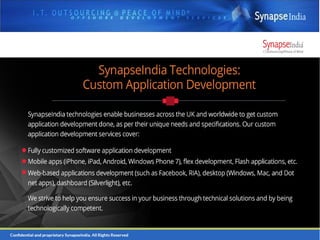 This document lists the social media channels and blogs for Synapse India Technologies. It includes their Twitter, Pinterest, Foursquare, and Instagram accounts as well as blogs on Weebly, WordPress, and Blogger.
