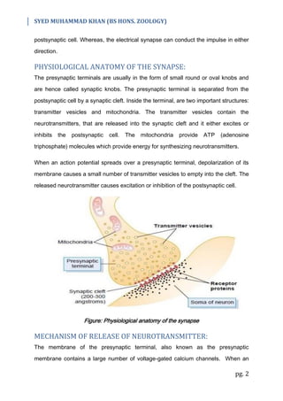 The document summarizes key aspects of synaptic transmission between neurons. There are two main types of synapses - chemical and electrical. At a chemical synapse, the presynaptic neuron releases neurotransmitters into the synaptic cleft that act on receptors in the postsynaptic cell. This can excite or inhibit the postsynaptic cell. The electrical synapse allows direct ion flow between connected cells. Over 50 chemicals act as neurotransmitters, including amino acids, biogenic amines, purines, and peptides. Neurotransmitters bind to receptors on the postsynaptic cell, which can open ion channels or activate second messenger systems to have long-lasting effects on cell excitability.