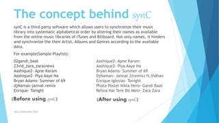 Sync is a music synchronization application developed by Amit Amola that organizes users' music libraries into alphabetical order by artist, album, and genre, making it easier to locate songs. It utilizes identification software like Shazam and Soundhound to categorize music and features a built-in radio that allows users to find and download songs they hear. Sync is available for free on iOS, Android, and Windows, with a premium version offering additional features for a nominal fee.
