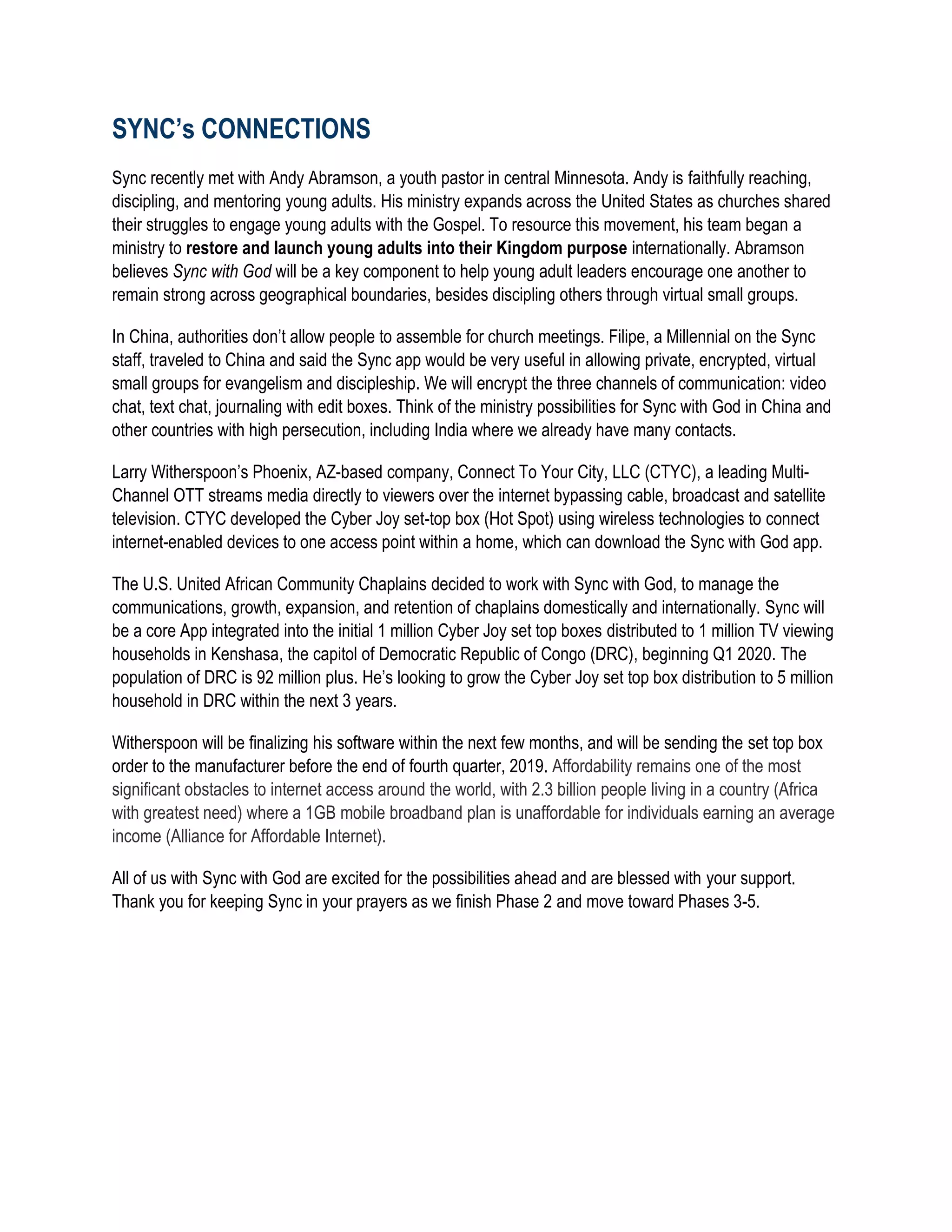Larry Witherspoon's company Connect To Your City develops the Cyber Joy box to connect devices to the internet. It can download Sync. The U.S. United African Community Chaplains will work with Sync to