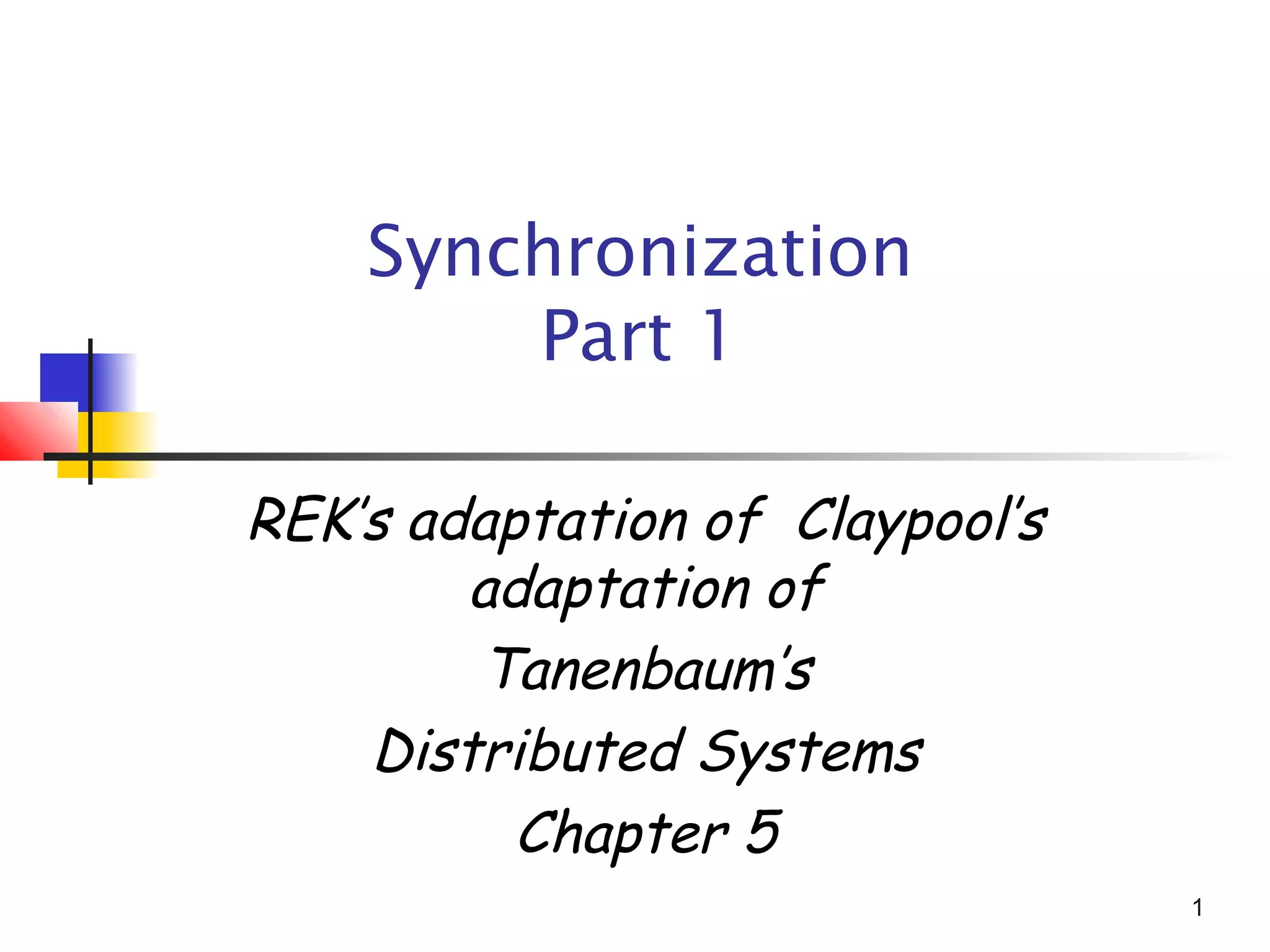 This document provides an overview of clock synchronization in distributed systems. It discusses how physical clocks can differ slightly in frequency and how precise atomic clocks are used to define International Atomic Time (TAI) and Universal Coordinated Time (UTC). It also describes several common clock synchronization algorithms, including Cristian's algorithm, the Berkeley algorithm, and averaging algorithms. Logical clocks are introduced as an alternative to synchronized physical clocks for maintaining consistency in distributed algorithms. Lamport timestamps are presented as a way to totally order events in a distributed system.