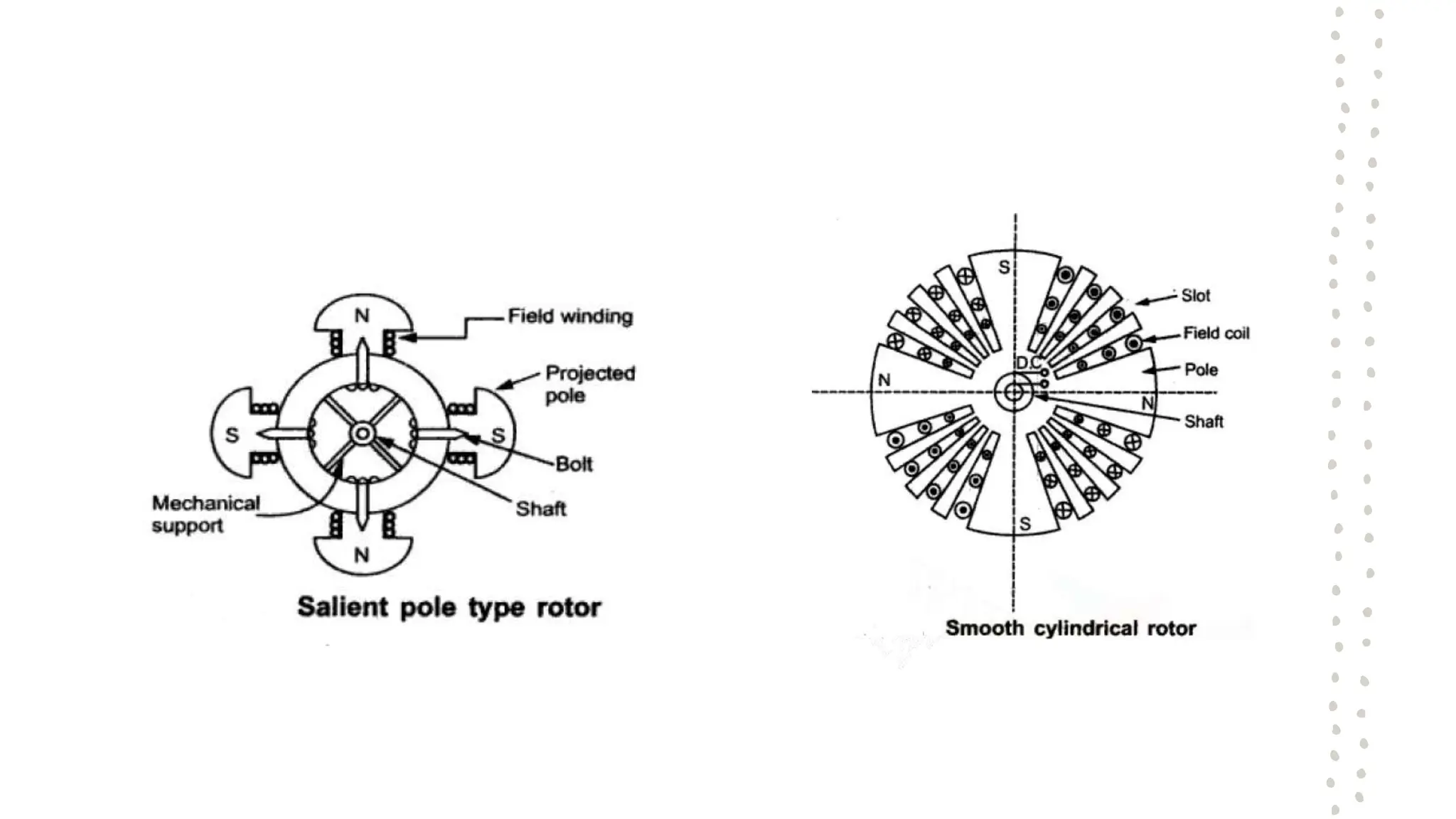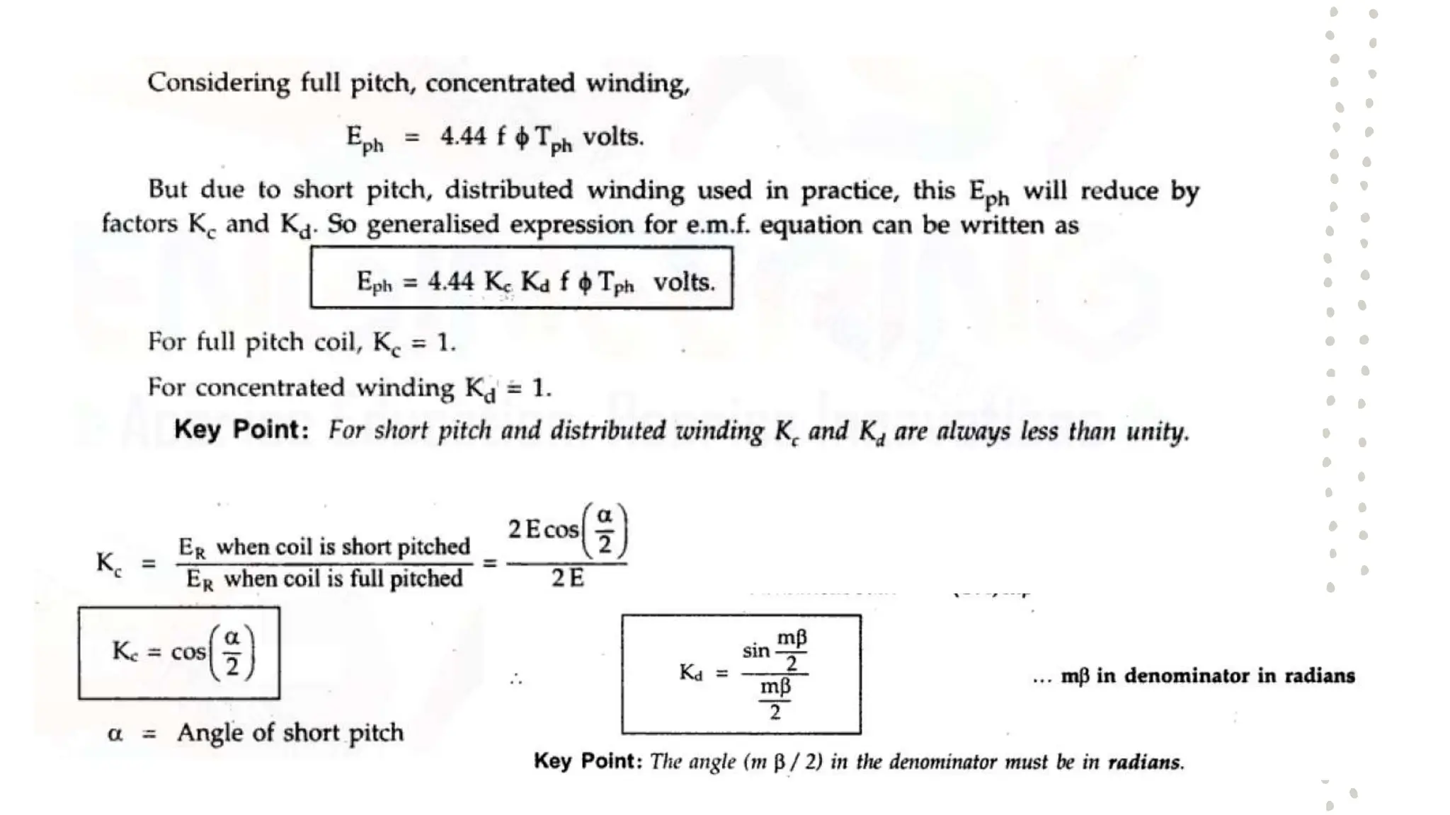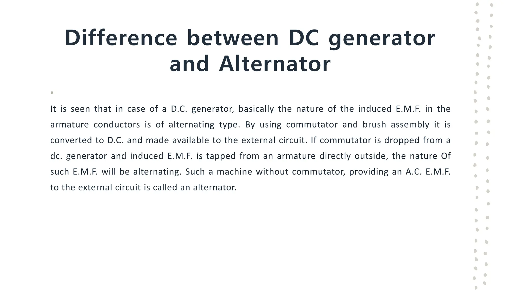 The document discusses the key differences between DC generators and alternators, emphasizing that a DC generator produces alternating e.m.f. in its armature conductors which is converted to DC via a commutator. Without the commutator, the machine becomes an alternator, providing AC e.m.f. directly. It also touches on the types of coils used in generators, specifically full and short-pitched coils.