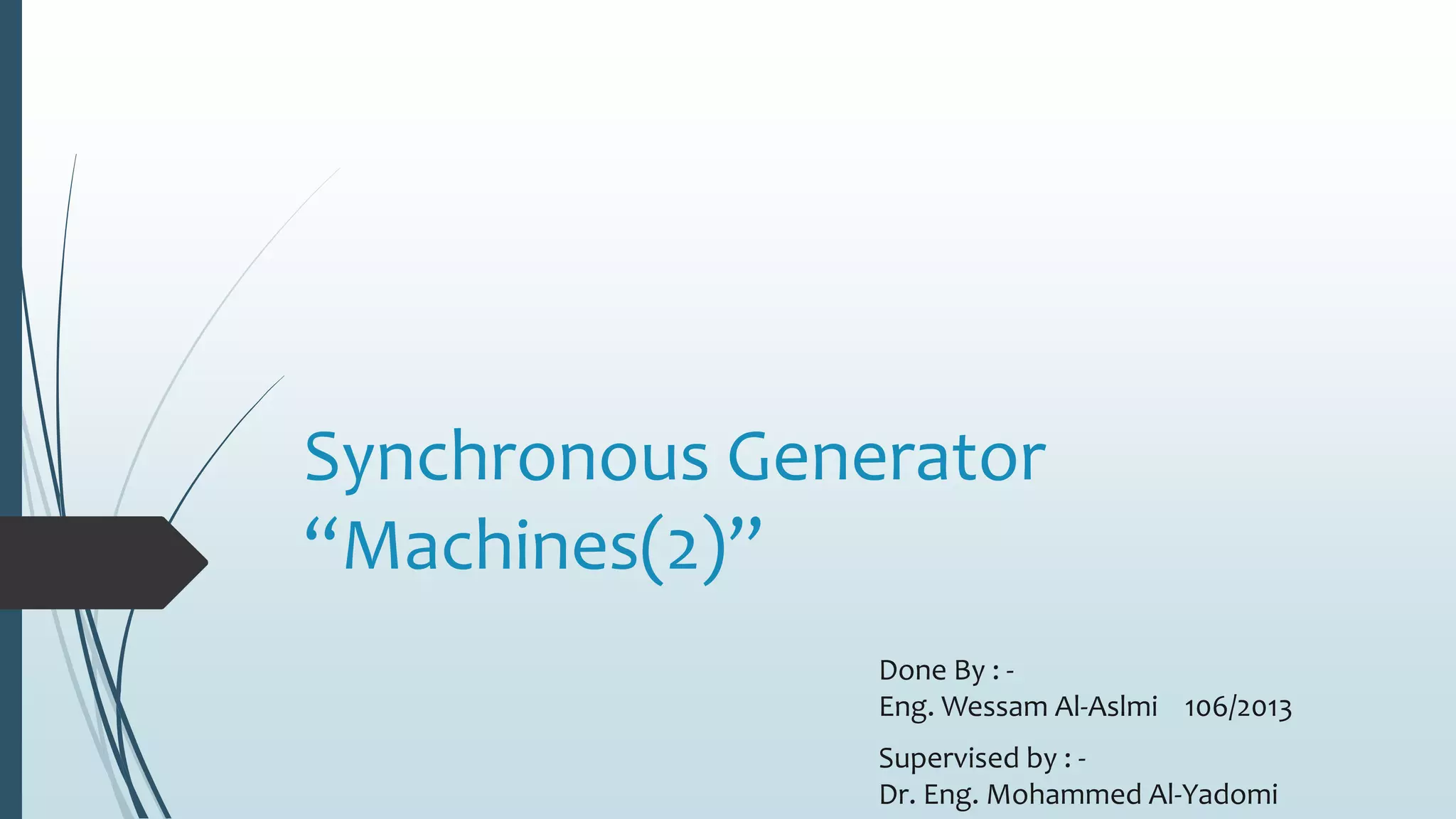 The document discusses synchronous generators, their operation, and their integration into utility grids, emphasizing the importance of understanding their structure and function for power engineers. It covers essential concepts such as generator P-F curves, parallel operation advantages, and the process of synchronizing generators with the utility grid. Additionally, it presents examples demonstrating how real and reactive powers are balanced in various operational scenarios.