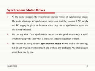This document discusses synchronous motor drives. Synchronous motors run at a constant synchronous speed when powered by AC current, but drives are used to make starting, pulling in, and braking smoother. Synchronous motors are not self-starting because their rotor cannot match the rotating magnetic field. They are started as induction motors until near synchronous speed, then DC field is applied. Pull in completes when the rotor matches synchronous speed. Dynamic braking is used by disconnecting the motor and connecting it to resistors, causing it to act as a generator and dissipate energy in the resistors.