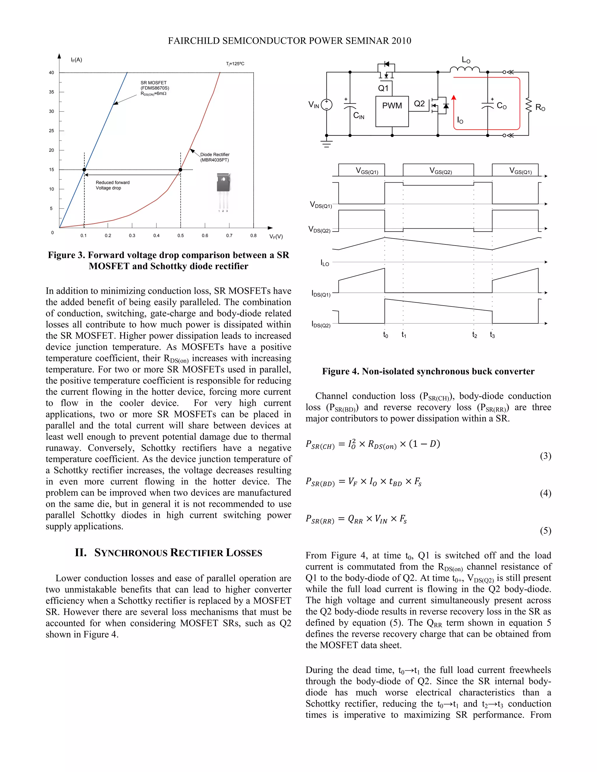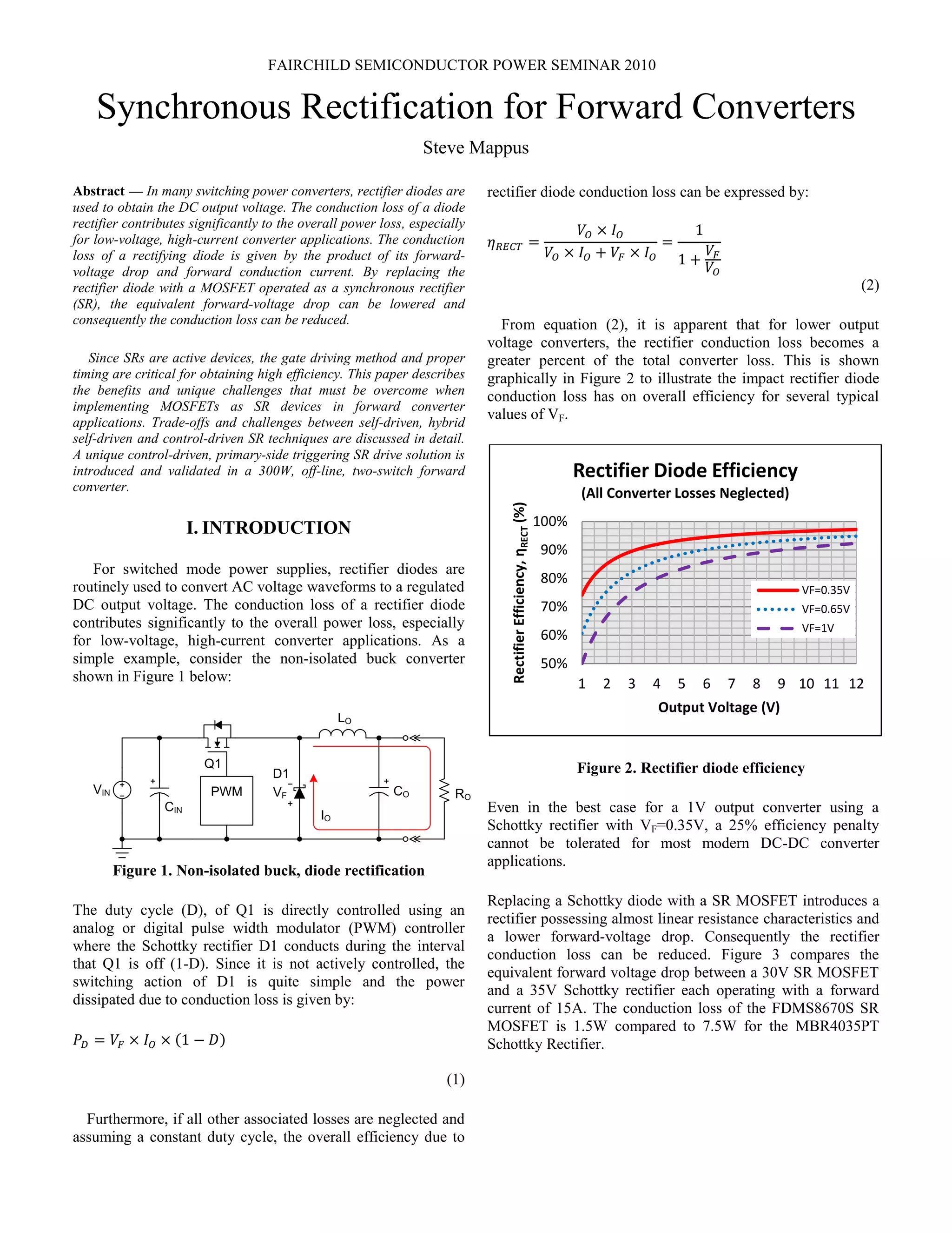 This document summarizes techniques for improving the efficiency of power converters by replacing diode rectifiers with synchronous rectifiers (SRs) using MOSFETs. SRs can reduce conduction losses by lowering the equivalent forward voltage drop compared to diodes. However, SRs introduce additional losses related to their body diode and switching operation that must be minimized through proper gate driving and timing. Integrating a Schottky diode with the SR MOSFET in a single package helps reduce body diode losses and reverse recovery effects. Optimizing the gate driving method and timing is critical for SR performance in forward converters.