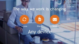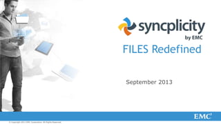 Files Redefined is a document about Syncplicity, a file sharing and collaboration platform. It summarizes that Syncplicity provides frictionless access to and sharing of files from any device. It allows users to securely access the latest versions of files without extra steps. Syncplicity also gives IT administrators security, control, and management capabilities to deploy the solution at scale across the enterprise.