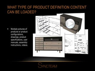 This document provides answers to frequently asked questions about the capabilities of the SynctTeam product demonstration app. It explains that the app can load multiple files like photos, drawings, manuals and videos to demonstrate products. It also allows isolating specific products for meetings, organizing products by categories, demonstrating product settings and kits, and easily navigating color or material options. Contact information is provided at the end for sales and support.
