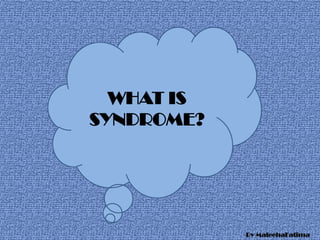 This document discusses and defines different medical syndromes. It begins by defining what a syndrome is, then lists and briefly describes 10 specific syndromes: tree-man syndrome, walking corpse syndrome, vampire syndrome, werewolf syndrome, stone-man syndrome, alien-hand syndrome, premenstrual syndrome, Noonan syndrome, Apert syndrome, and Ehlers-Danlos syndrome. Each syndrome is then discussed in 1-2 paragraphs with details about symptoms, causes, and characteristics.