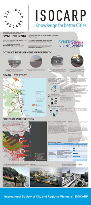 This document proposes interventions to improve Gdynia, Poland by making it more people-focused and innovative. It identifies 8 focus points in the city and recommends enhancing cultural and creative industries, improving multi-modal transportation connectivity, and promoting more public and private partnerships. Specific initiatives proposed include a fishermen village integration program, cultural exchange programs for youth, expanding facilities like Fab Labs, and developing a flagship waterfront space called SWWIM to promote water sports and the local community. The goal is to connect Gdynia's assets like forests, sea, port and city center through better transportation while boosting its economy and engaging residents.