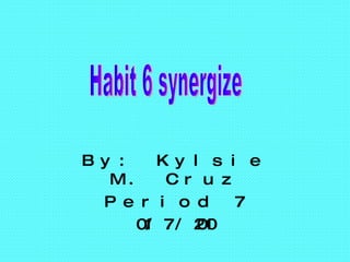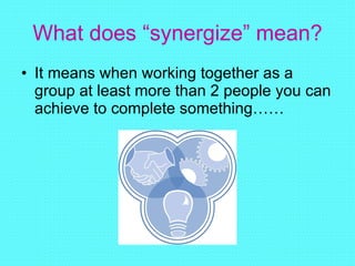 Synergize means working together in a group to achieve more than what individuals could alone. Synergy occurs when people collaborate to find better solutions, are open-minded, and celebrate differences rather than just tolerating them. It is important to value others' opinions and differences, and see diversity as something to appreciate rather than just accept. Synergizing allows groups to find solutions that may not be apparent to individuals working separately.