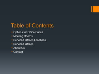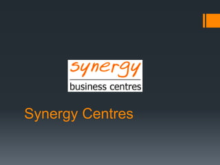 This document provides information about Synergy Centres, which offers various office solutions including serviced offices, virtual offices, meeting rooms, and administrative support. They have locations in Sydney, Canberra, and Wollongong. Options for serviced offices include mail forwarding, phone answering, and access to business lounges. Meeting rooms come equipped with AV equipment and various amenities. Their goal is to be a flexible address for businesses without the commitment of a full-time office.