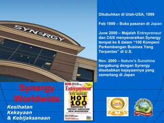 Synergy Worldwide, established in Utah in 1999, has gained recognition in the health and wellness industry and achieved rapid growth, including a partnership with Nature’s Sunshine. The company operates in 62 countries, offers a marketing plan with high bonus potential, and a unique structure for member registration and product purchase. Members can earn through various commission structures, including retail profits, leadership bonuses, and international bonuses, with a focus on promoting health products.