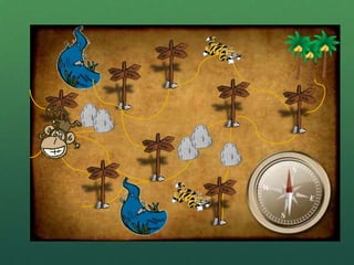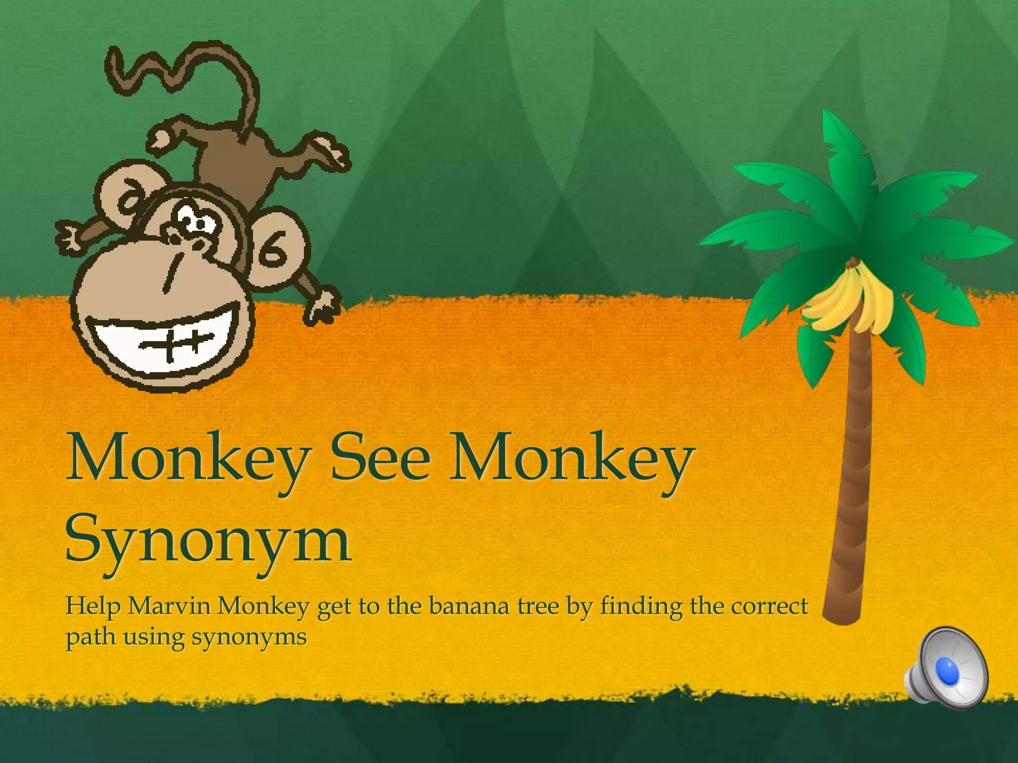 This interactive document teaches about synonyms through a game where the player helps Marvin Monkey navigate the jungle by choosing the correct synonym at each intersection. It provides examples of synonyms and has the player practice identifying synonyms to help Marvin reach the banana tree. When the player selects incorrectly, it reminds them that synonyms are words that mean the same thing. Upon choosing all the synonyms correctly, it congratulates the player on their knowledge of synonyms.