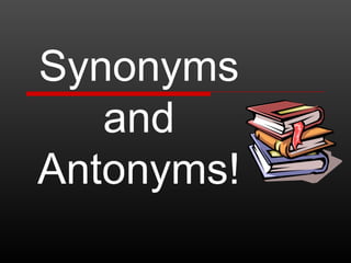 This document provides information about synonyms and antonyms. It begins by giving an example of the word "evening" and asking the reader to find a synonym. It then defines what a synonym and antonym are. The document explains that a synonym is a word with the same or similar meaning, while an antonym is a word with the opposite meaning. It provides several examples of synonyms and antonyms. It encourages the reader to find synonyms and antonyms of given words. In the end, it suggests games to practice identifying synonyms and antonyms.