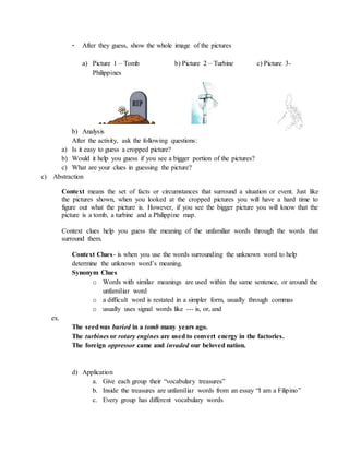 2) Students will be divided into groups and tasked with guessing the meaning of unfamiliar words from a passage using context clues provided in sentences.