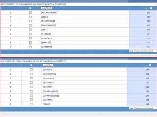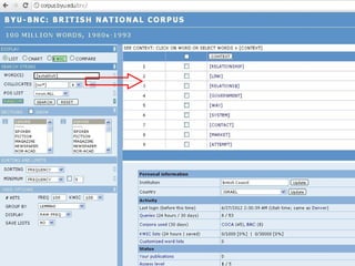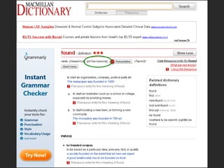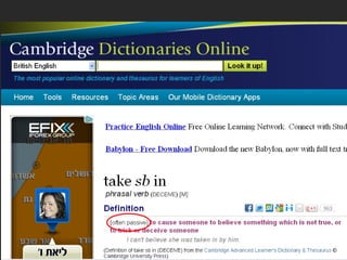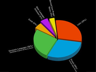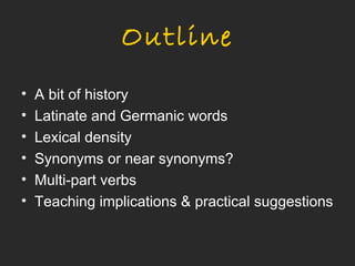 The document summarizes a presentation about synonyms and near-synonyms in the English language. It discusses the influence of Latin and Germanic roots on the vocabulary, the abundance of synonyms and nuances between near-synonym pairs. It also addresses implications for language teaching such as teaching collocations and semantic prosodies when introducing synonyms.