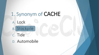 The document lists 100 important synonyms for various words starting with the letter 'c.' Each entry provides a word and its corresponding synonym options, highlighting meanings and nuances. This resource serves as a vocabulary enhancement tool, particularly for words beginning with 'c.'