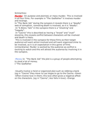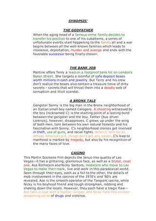 The document provides synopses for four films: The Godfather, The Bank Job, A Bronx Tale, and Casino. All four films involve murder and organized crime plots. The Godfather depicts a power transfer in a crime family that leads to war between families. The Bank Job involves robbing a bank for cash and jewels that also contains secrets. A Bronx Tale shows a boy torn between a gangster and his father as he comes of age. Casino depicts two mobsters involved in the 1970s-80s Las Vegas casino world who both have tragic flaws.