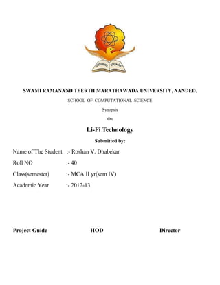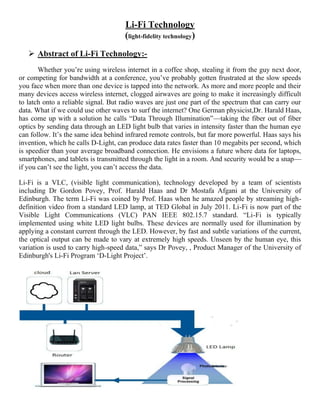 Li-Fi technology uses visible light communication and LED bulbs to transmit data wirelessly at speeds faster than Wi-Fi. It works by varying the intensity of LED lights faster than the human eye can detect, using the variations to transmit data. Researchers have achieved speeds over 500 megabytes per second in the lab. Li-Fi could provide internet access simply by lighting a room without interfering with radio frequencies. It offers more available bandwidth than Wi-Fi and improved security since the light cannot pass through walls.