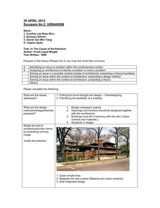 Frank Lloyd Wright's 1908 text "In The Cause of Architecture" addresses two main issues with contemporary architecture: overdesigning buildings and prioritizing aesthetics over functionality. Wright proposes a design strategy of simplicity, with an emphasis on designing only necessary spaces, selecting materials and colors that harmonize with the site, and integrating openings and furniture into the overall architectural design. The key image that relates to Wright's theories is a building with clean, simple lines that respects the site context through its material and color scheme, representing an integrated, unoverdesigned design.