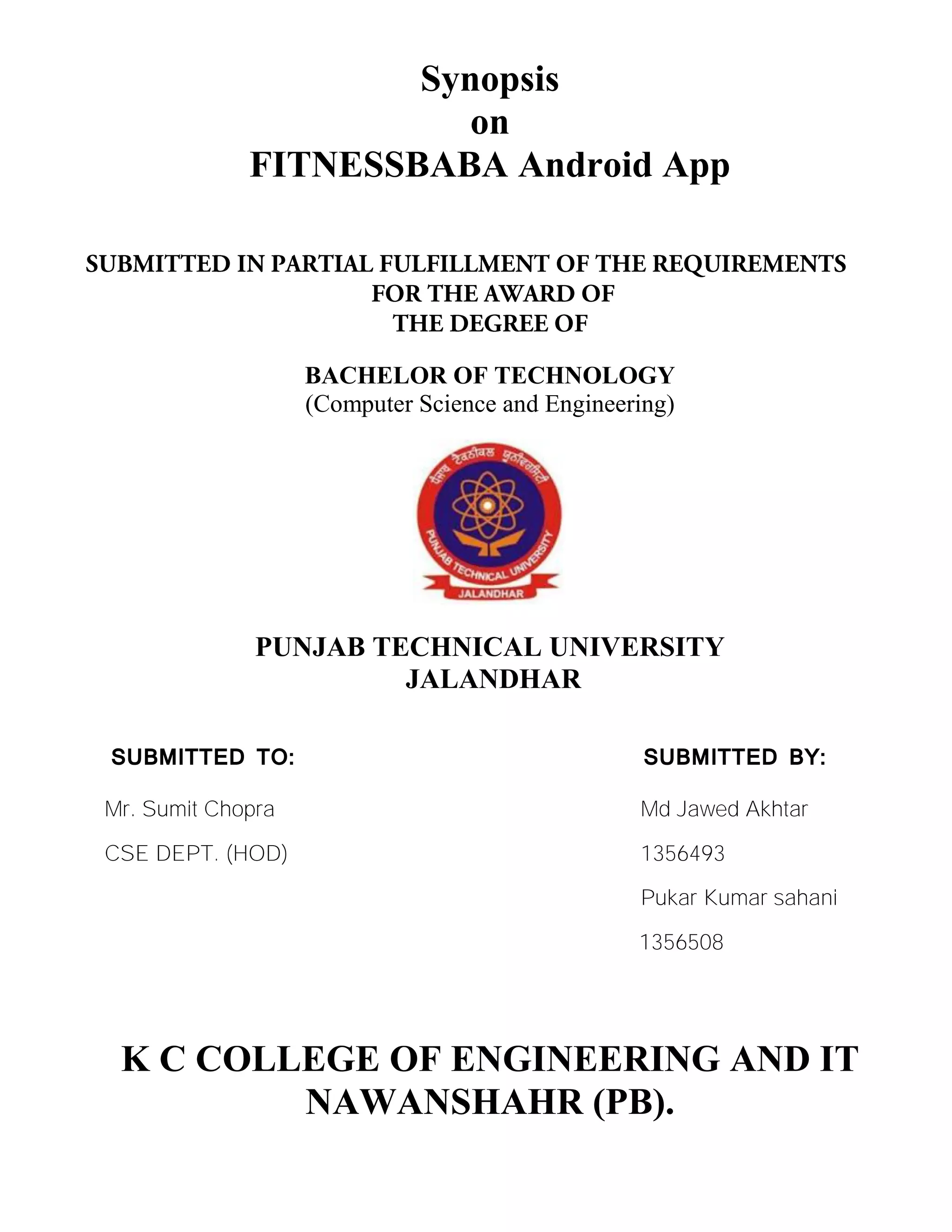 This document provides an overview of the FITNESSBABA Android application project. It includes sections on the overview of the Android OS and features, the technology used to develop the app like Android Studio and Java Development Kit, an introduction to the app and its four activities, and system specifications. The objective of the app is to provide gym tricks and exercises to users to help them stay fit at home without a trainer.
