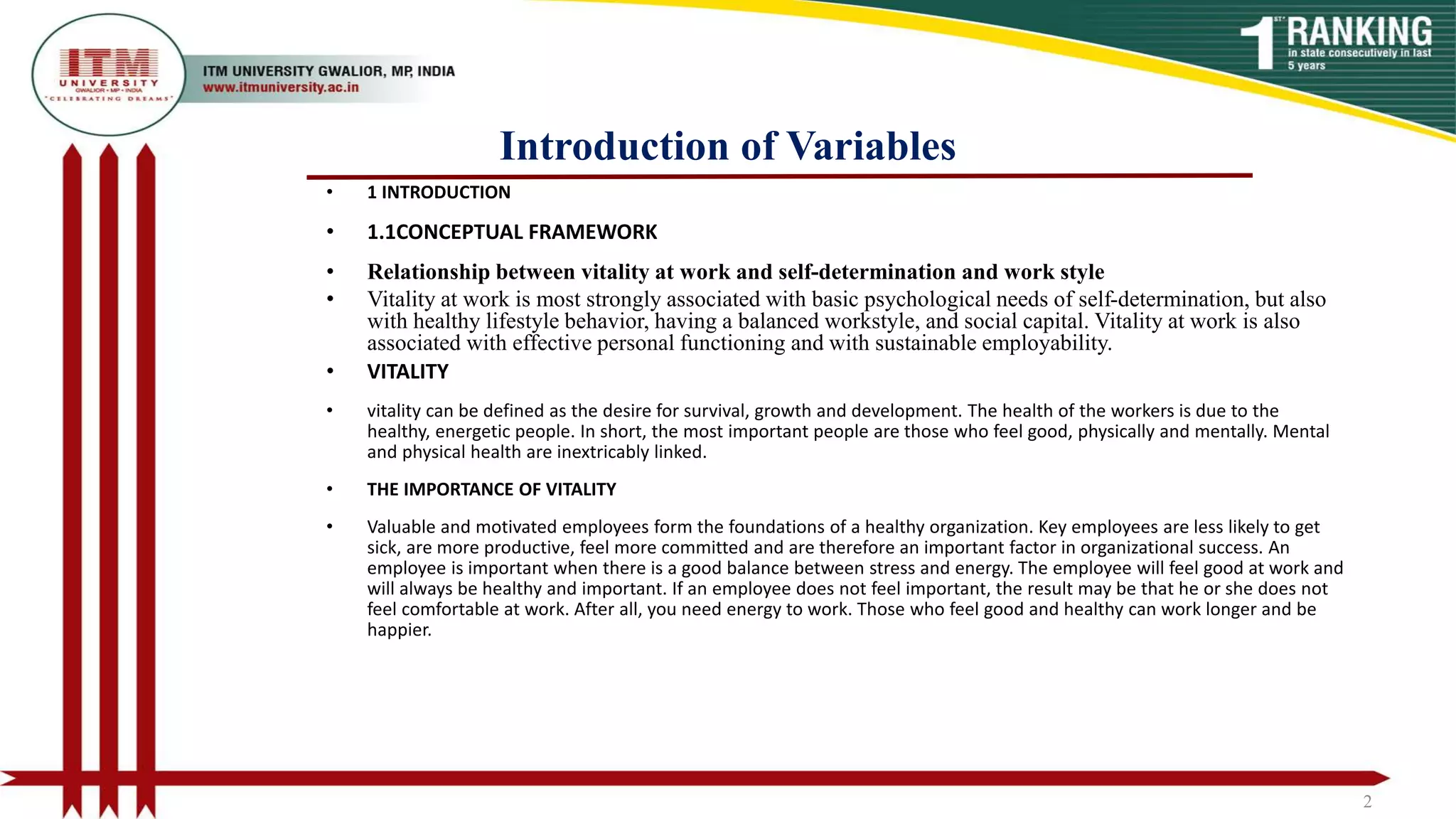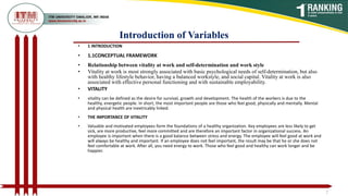 The document discusses vitality at work and its associations with work style and self-determination. It defines vitality as the desire for survival, growth, and development, and notes that vitality at work is closely linked to basic psychological needs of self-determination as well as healthy lifestyle behaviors and a balanced work style. The document reviews several studies that examined relationships between vitality, self-determination, leadership, engagement, motivation, and job satisfaction.