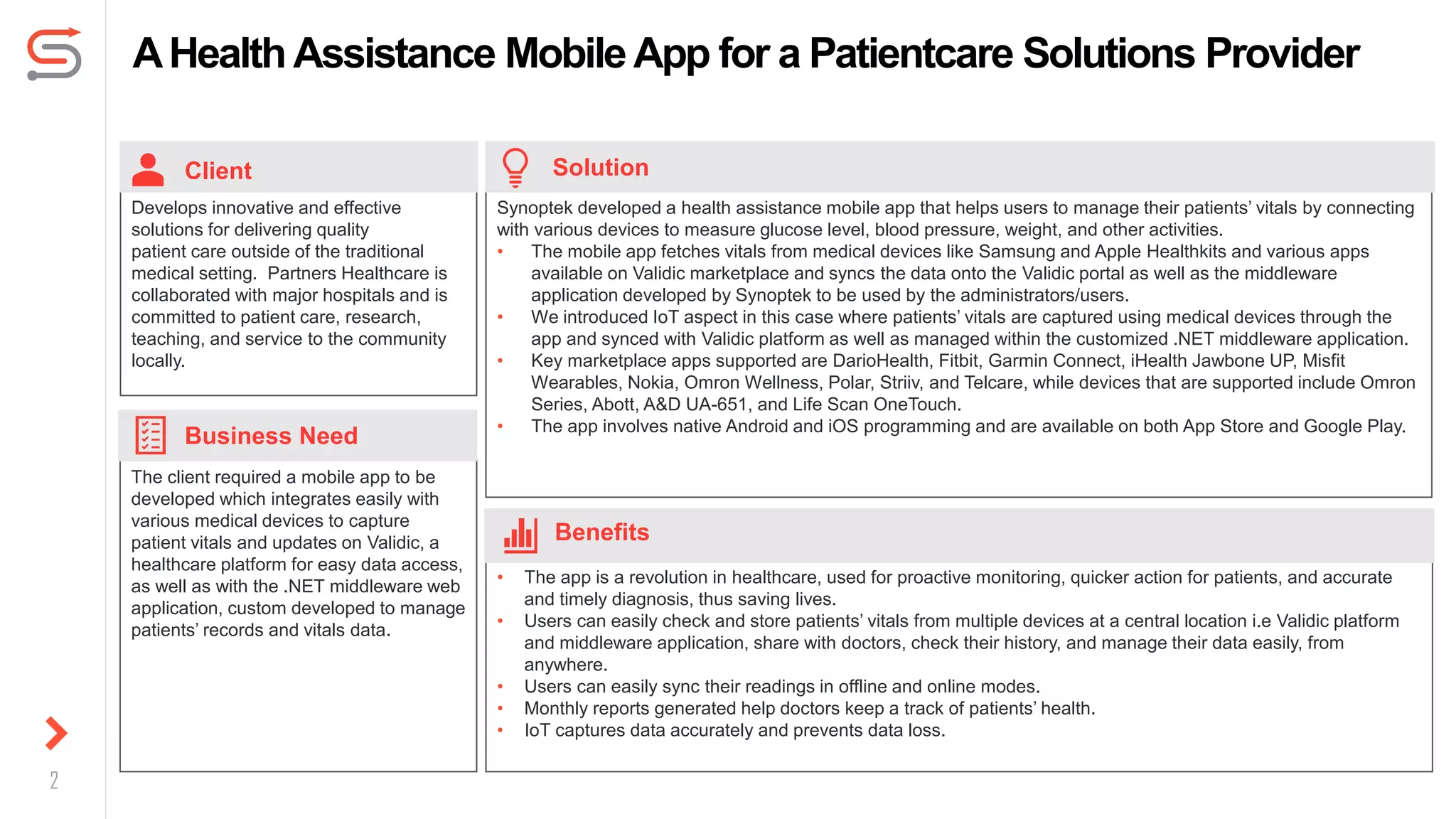 Synoptek developed a health assistance mobile app that connects with various medical devices to manage and sync patient vitals, such as glucose levels and blood pressure, with the Validic platform and a custom .NET middleware application. The app supports multiple devices, allows for easy data access in both online and offline modes, and generates monthly reports for doctors to monitor patient health. This innovative solution aims to enhance patient care by enabling proactive monitoring and efficient data sharing between users and healthcare providers.
