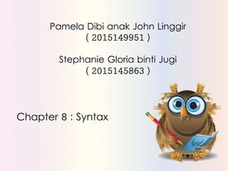 This document discusses syntax and syntactic analysis. It defines syntax as the study of the structure of language and how words are arranged in sentences. Syntactic analysis involves developing rules to describe the structure of sentences based on constituents like noun phrases and verb phrases. These rules are represented using tree diagrams and phrase structure rules. The goal is to have a small set of rules that can generate a large number of grammatical sentences. Movement rules allow rearranging constituents to form questions.