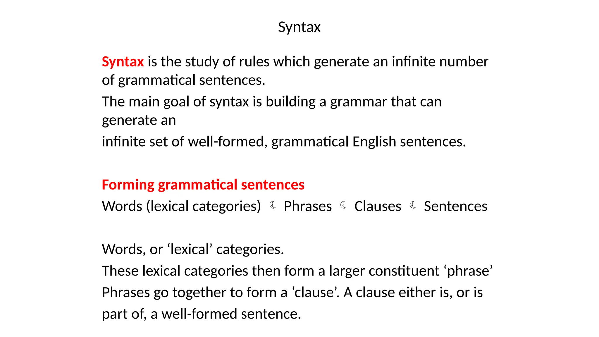 The document discusses syntax, focusing on the rules that govern the formation of grammatical sentences in English. It explains the classification of words into lexical categories based on meaning, morphological form, and syntactic function, and also distinguishes between content and function words. Additionally, the document highlights the complexities involved in categorizing words and the syntactic environments that reveal their roles in sentence structure.