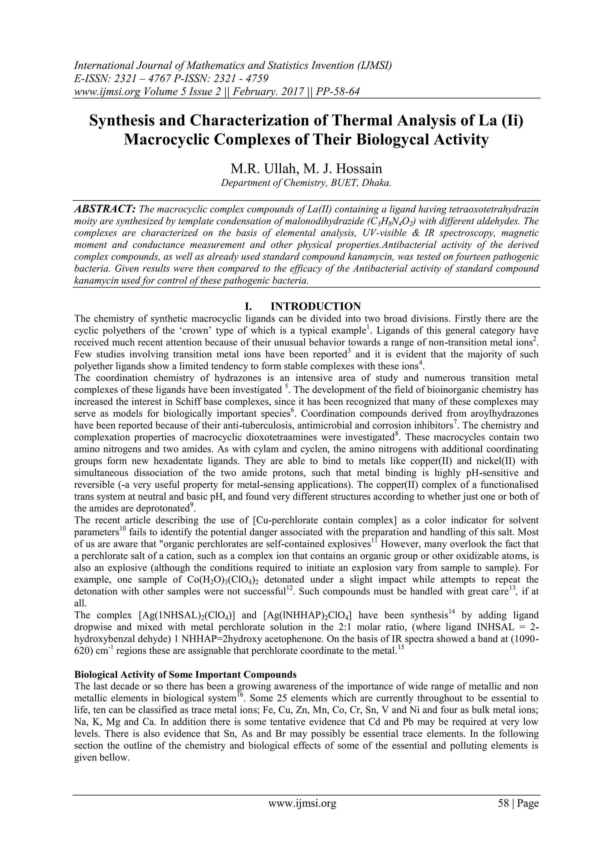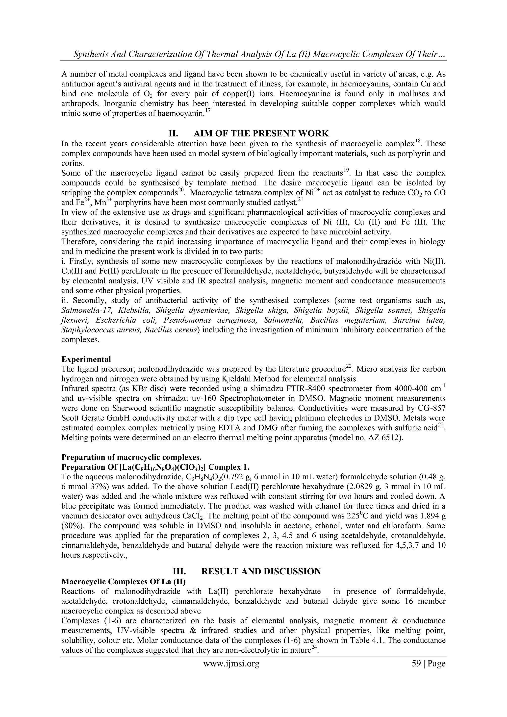 This document details the synthesis and characterization of La(II) macrocyclic complexes using malonodihydrazide and various aldehydes, evaluating their physical and biological properties. The complexes were analyzed through methods like elemental analysis, UV-visible, and IR spectroscopy, and their antibacterial activities were tested against several pathogenic bacteria. The study highlights the significance of such complexes in bioinorganic chemistry and their potential applications in medicine.