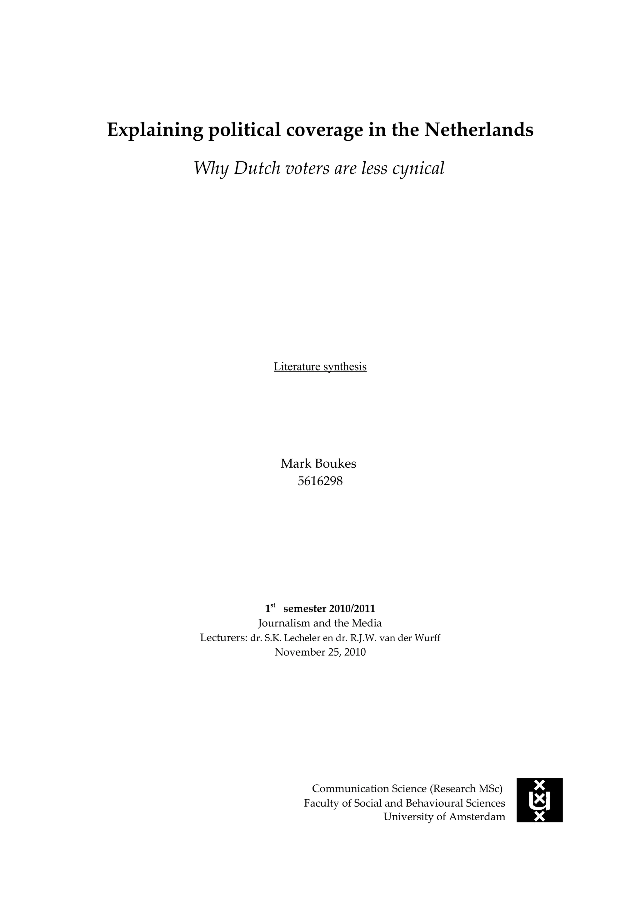 This document analyzes the differences in political news coverage between the Netherlands and the United States, concluding that Dutch coverage is generally more substantive and less cynical. Factors contributing to this include a strong public broadcasting system and a multiparty political framework, which discourages negative campaigning. The study suggests that the presence of commercial pressures in media affects the coverage but that their impact is mitigated in the Dutch context.