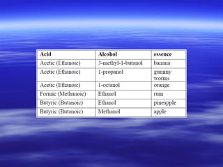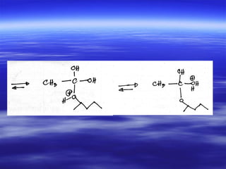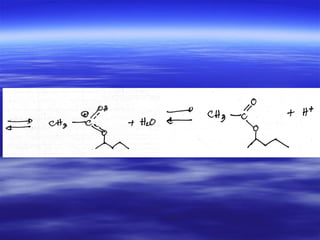 This document discusses the synthesis of esters via nucleophilic acyl substitution. Esters are used in perfumes, foods, solvents, and fuels. The procedure involves refluxing a carboxylic acid and alcohol with sulfuric acid, then separating the organic layer containing the ester product. The overall reaction is an esterification via nucleophilic acyl substitution.