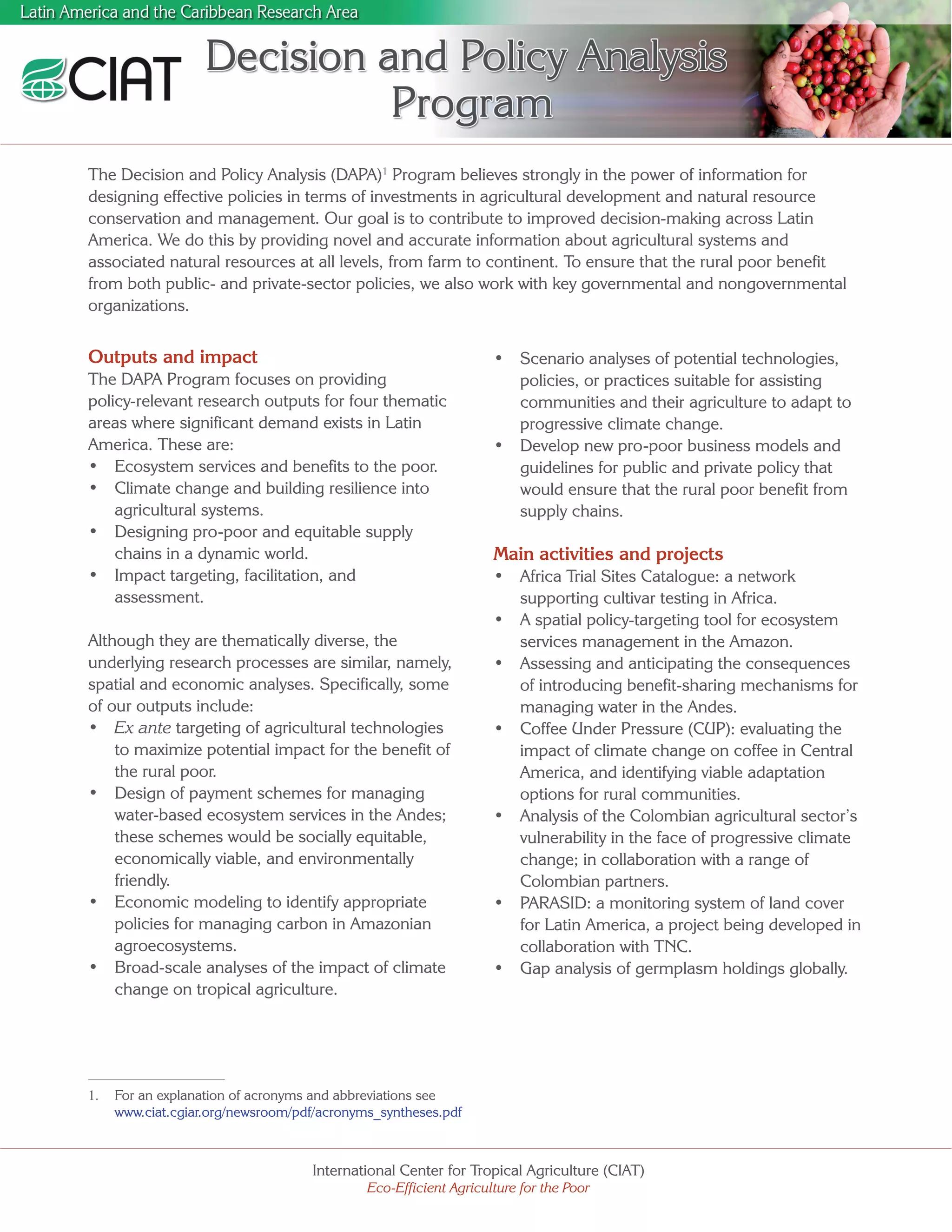 The DAPA program aims to enhance decision-making in agricultural development and natural resource management across Latin America by providing relevant information and collaborating with governmental and nongovernmental organizations. Their focus includes developing pro-poor business models, addressing climate change, and creating equitable supply chains, with diverse activities such as scenario analysis, spatial policy targeting, and impact assessments. Key outputs include evaluations of agricultural technologies and climate adaptation strategies to benefit rural communities.