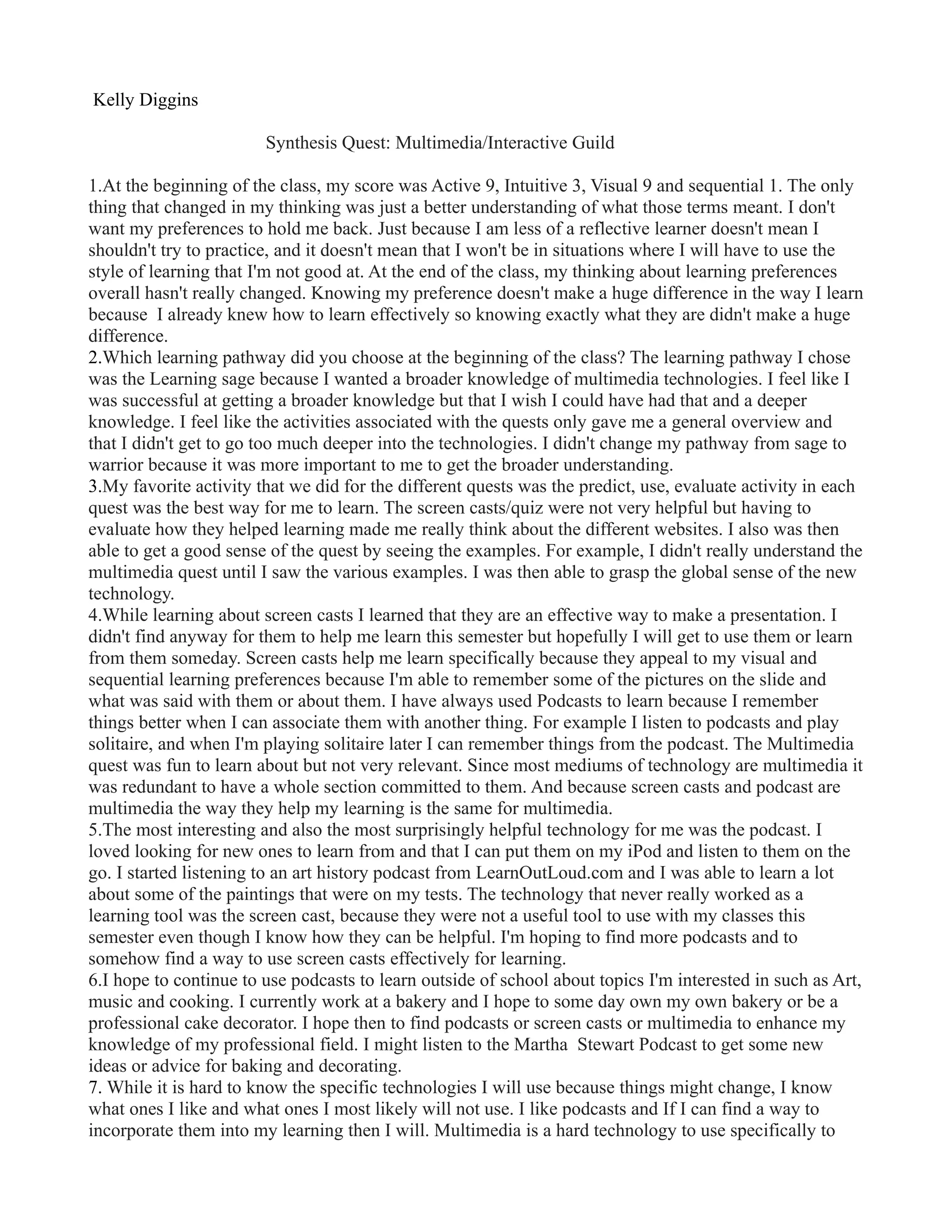 1. Kelly chose the Learning Sage pathway at the beginning of class to gain a broader knowledge of multimedia technologies. However, she felt the activities only provided a general overview and she wished she could have gained deeper knowledge as well.