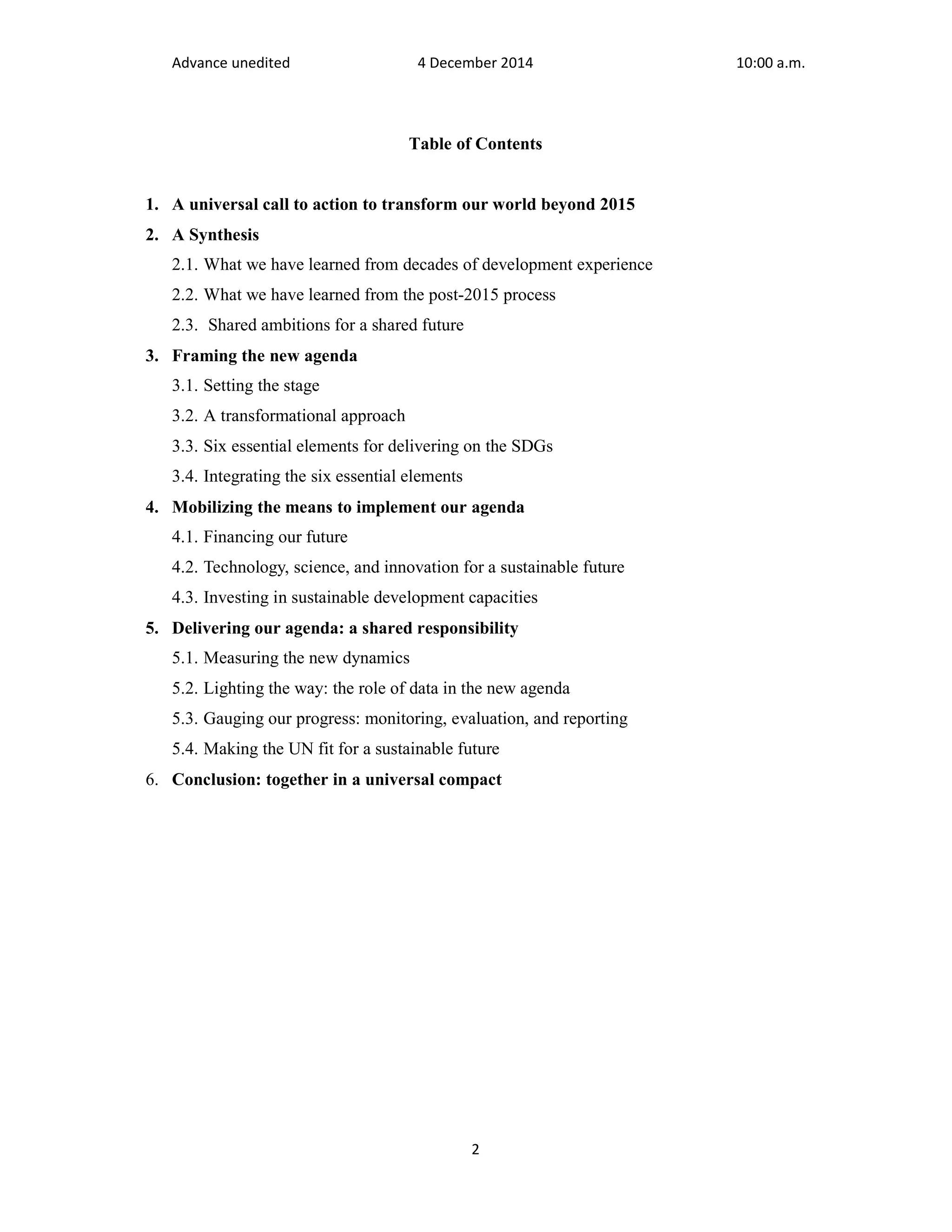 This document is the United Nations Secretary-General's report on the post-2015 development agenda. It discusses the need to end poverty and promote sustainable development by 2030 through a universal agenda. It reviews lessons from the Millennium Development Goals and calls for a transformational approach integrating six essential elements: dignity, prosperity, justice, partnership, planet, and people. It emphasizes mobilizing financing, technology, and capacities to implement the agenda through shared responsibility.