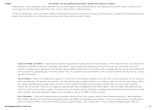 MIDI controllers are versatile electronic instruments used across various settings such as stages, studios, and homes for audio and visual performance. They can be classified by form factor, including keyboard controllers, DJ controllers, pad controllers, foot pedals, and more, each serving different purposes. The document provides an overview of these types, along with examples and their applications in music and multimedia production.