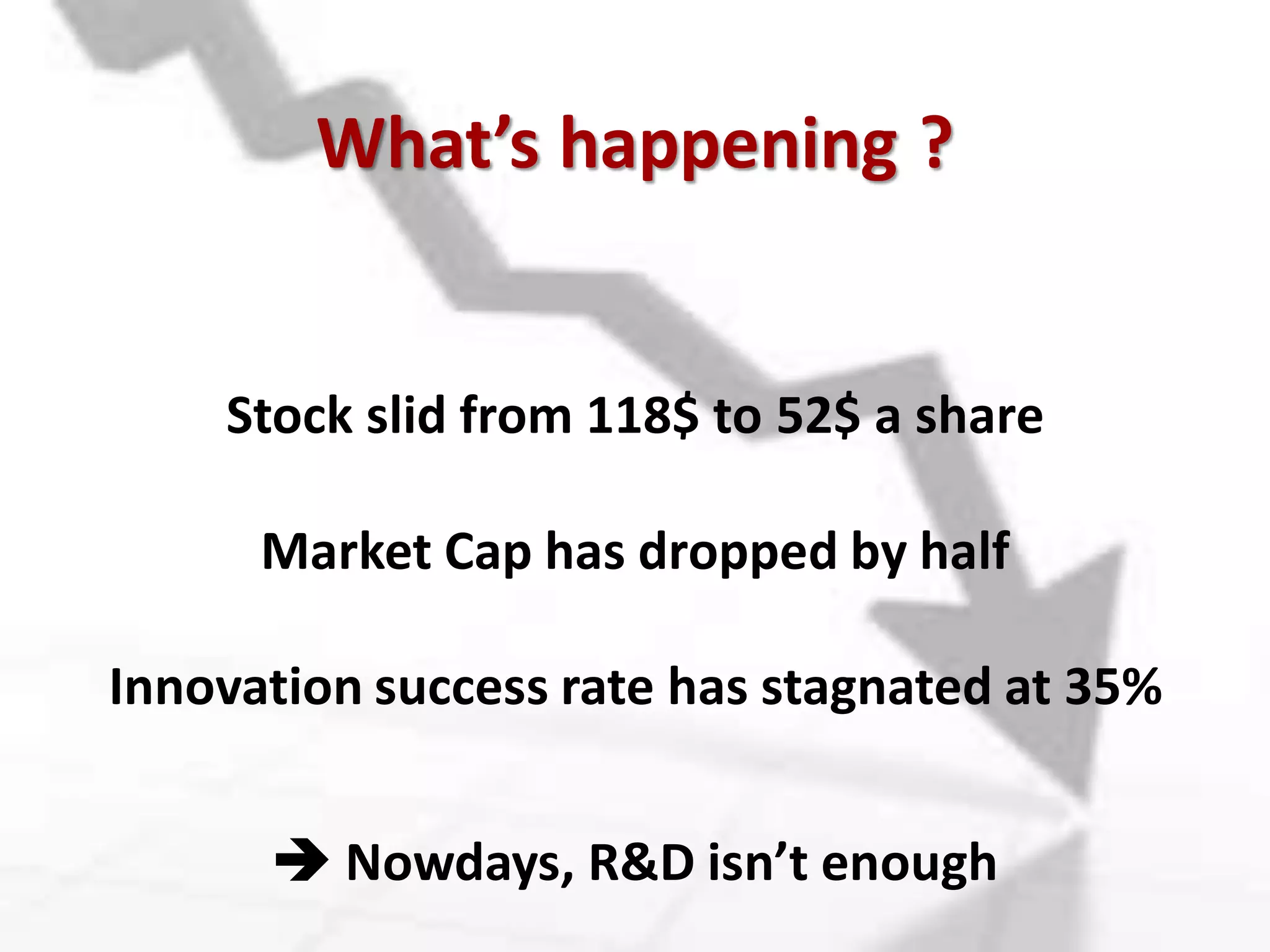 This document discusses Procter & Gamble's shift from an "invent-it-ourselves" closed innovation model to an open innovation "Connect & Develop" strategy in response to stagnating innovation success rates and declining market performance. The new strategy aims to acquire 50% of innovations from outside the company by transforming R&D processes to engage over 1 million external innovators through proprietary and open innovation networks. This represents a strategic shift beyond optimization to engaging the company's management in an open, crowdsourced model focused on customer needs to sustain growth in a changing innovation landscape.
