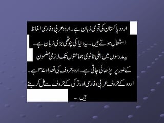 Urdu is the national language of Pakistan and the fourth most widely spoken language in the world. It is compulsory to study in higher grade levels and consists of 37 alphabets that combine letters from Arabic, Persian, and Turkish alphabets.
